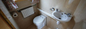 The galley has a fitted cooker with 4-burner hob, oven and grill, fridge, microwave, lots of storage and tiled worktop. The forward toilet has a washbasin and shelf. There is a dividing door in the corridor.