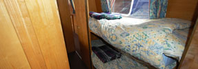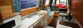 The back end is cruiser style with a handrail. The master bedroom has a fixed double bed (our special one-poster design) with sprung mattress, drawers under, a wardrobe, wet locker and airing cupboard. The bathroom has a shower bath, toilet, basin with shelves, and radiator. There are dividing doors in the corridor. The middle bedroom is in two compartments with a dividing door. Each has a fixed single bed, over which an optional top bunk can be fitted. The mattresses are foam covered with cloth. There are drawers and storage under the beds, with shelves and a hanging space. The forward toilet has a washbasin and shelf. The galley has a fitted cooker (with 4 burners, grill and oven), fridge, microwave and lots of storage. The saloon at the front has an L-shaped settee with a table which can be hidden away when not required. The settee converts either to a double bed or to two singles. There are large drawers under the settee. Radio CD player with 4 speakers, and TV/DVD player. The front cockpit has seats either side. An inverter proves 240v AC, to power any of your own normal mains appliances up to 1000 watts. There is mains hair dryer (more powerful than on other boats). The engine is an Isuzu 4-cylinder water-cooled diesel.
